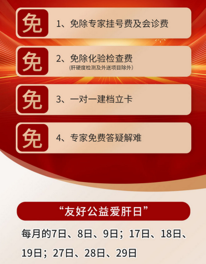 為助力“2030 消除病毒性肝炎公共衛生危害行動目標”貫徹落實國家肝炎防治計劃,普及病毒性肝炎防治知識,提高市民對肝病的認識,加強對病毒性肝炎等慢性肝病的防治,做到早發現、早預防、早診治、早康復,早日消除病毒性肝炎公共衛生危害!鄭州友好肝膽醫院聯合肝炎防治基金會、檢測試劑廠家、社會公益組織機構等共同發起“消除肝炎 積極行動”2024 河南乙肝臨床治愈康復行動暨肝膽腫瘤防治系列活動,為切實減輕廣大肝病患者經濟負擔,讓更多肝病患者享受惠民政策,鄭州友好肝膽醫院特決定每月定期開展主題為“主動檢測、擴大治療、消除肝炎危害”的公益愛肝日惠民活動。